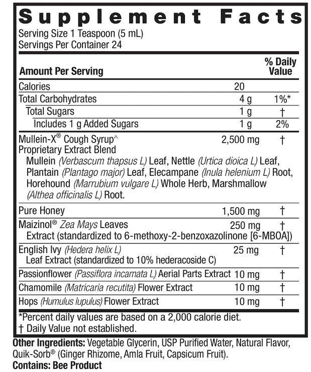 Nature’s Answer Mullein-X® Cough Syrup^ PM is a natural blend of herbal ingredients formulated to help clear mucus*, soothe an irritated throat*, and support upper respiratory health*. Our nighttime formula contains Maizinol®, (standardized to 6-methoxy-2-benzoxazolinone [6-MBOA]) a melatonin-free, natural supplement derived from Non-GMO maize, clinically proven to increase the restorative stage of sleep.* This unique formula features 1,500 mg of Pure Clover Honey, a Proprietary Herbal Blend of 2,500 mg of Mullein, Nettle, Plantain, Elecampane, Horehound, and Marshmallow, and is enhanced with English Ivy (standardized to 10% hederacoside C). The formula also offers additional natural relaxation support from Passionflower, Chamomile, and Hops.